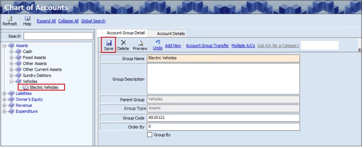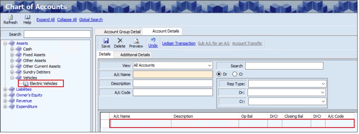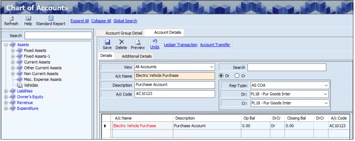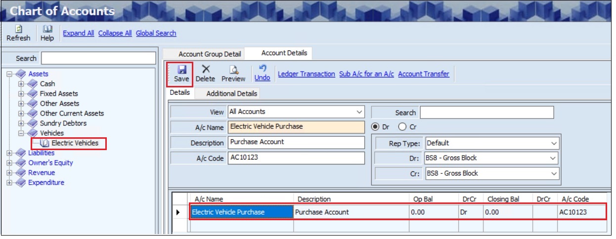 Click Save, the Account Name, Description, Opening Balance, Debit or Credit, Closing Balance, Debit or Credit and Account Code will appear in the Account Details section.