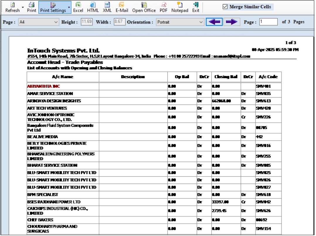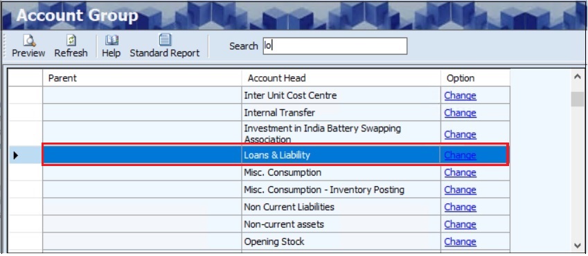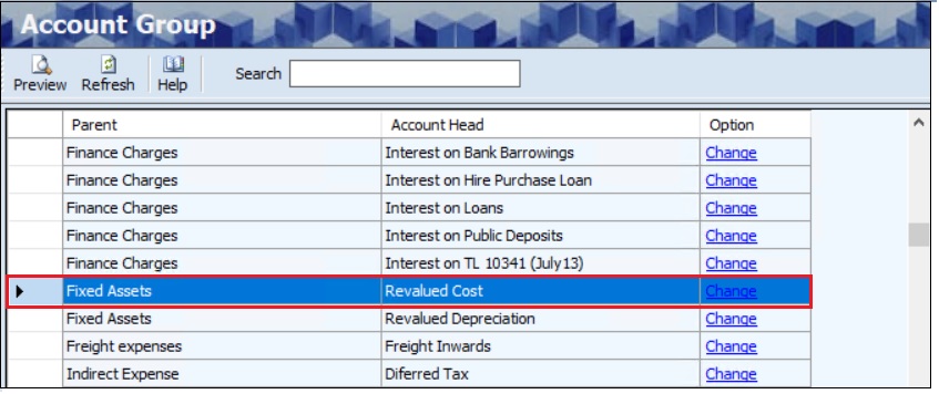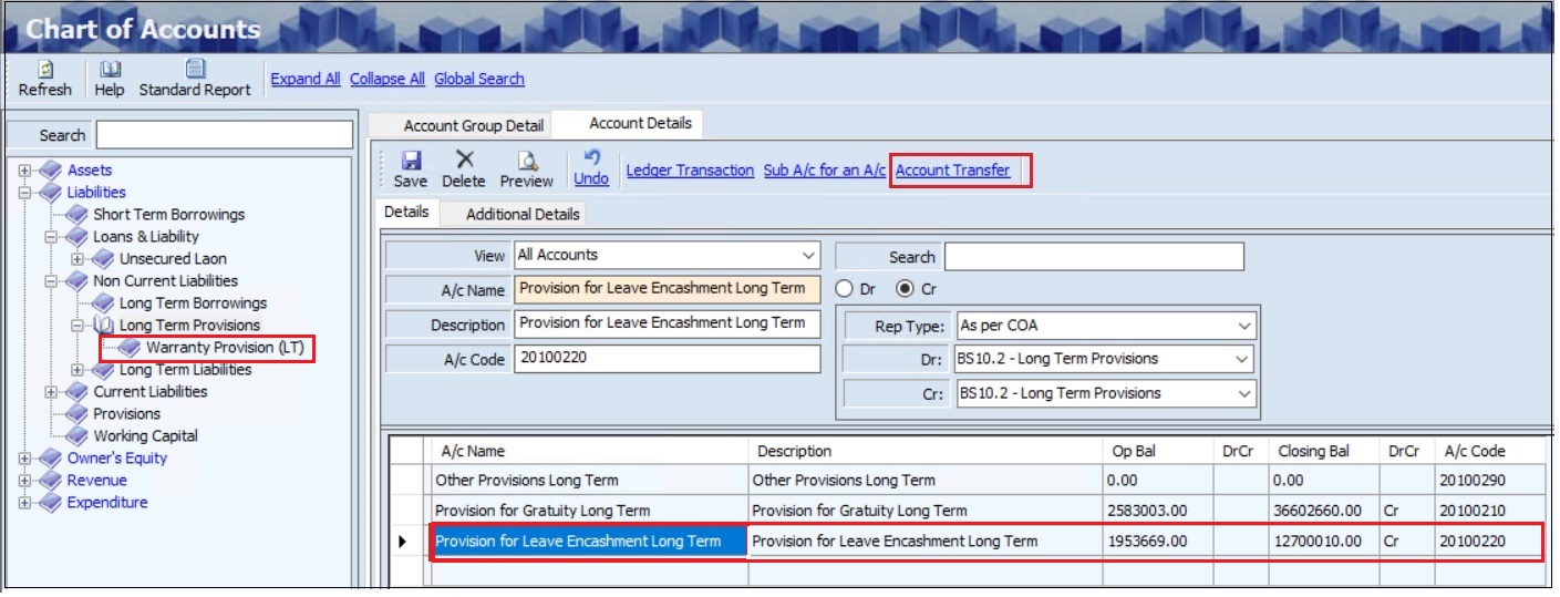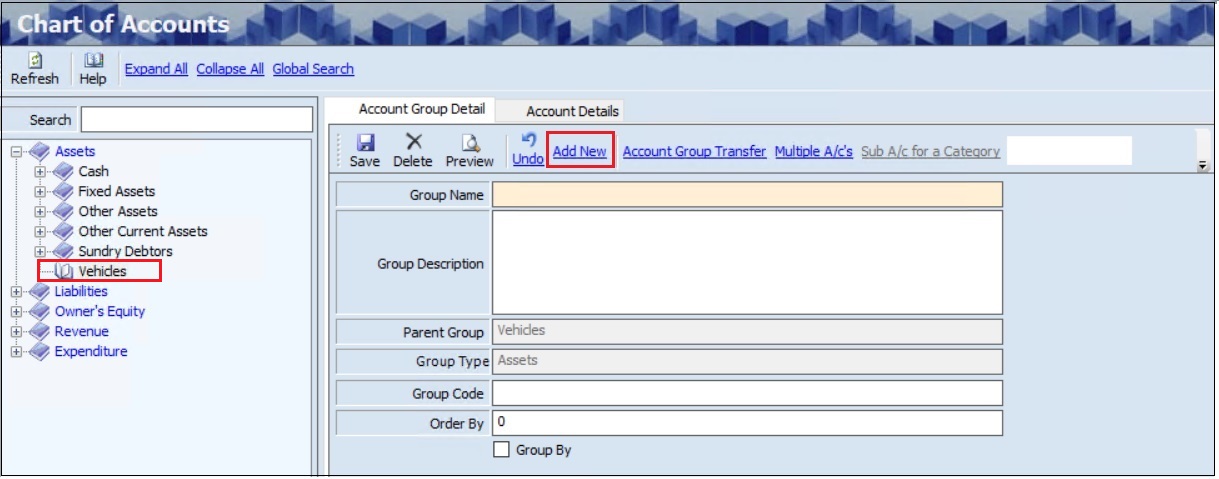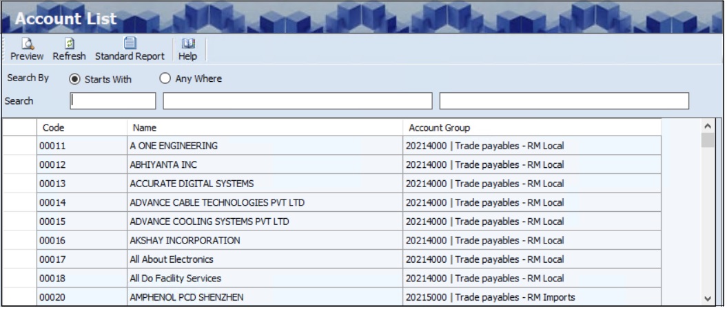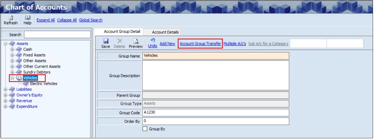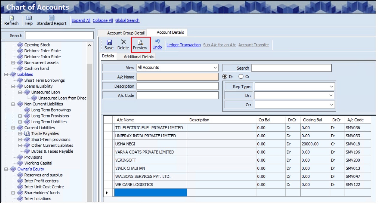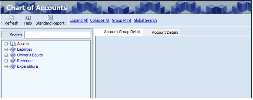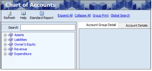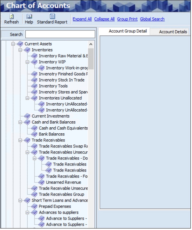 Once the user selects the Account Group, the Ledgers / Account Details will appear in the Account Detail tab.