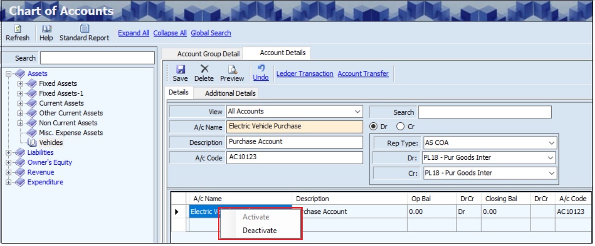 The user can select Activate to activate a deactivated Account Name or Ledger.