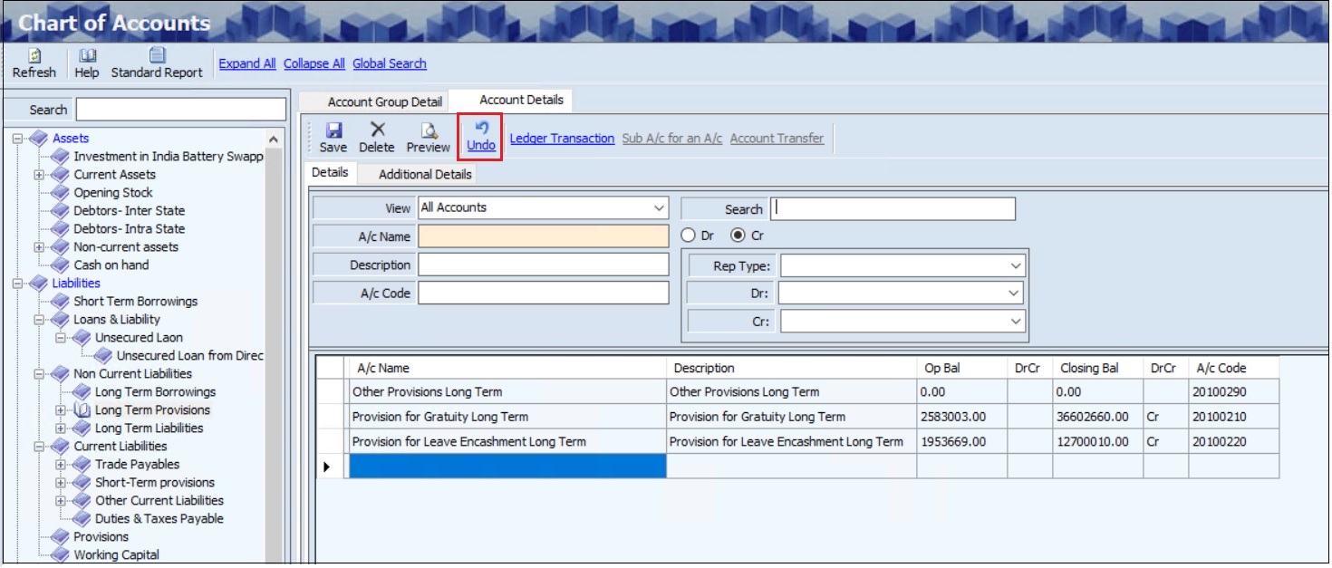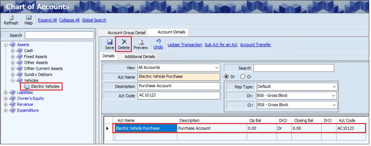 The Delete option allows the user to delete the added or existing account or ledger details if there is no associated transaction corresponding to the specified account.
